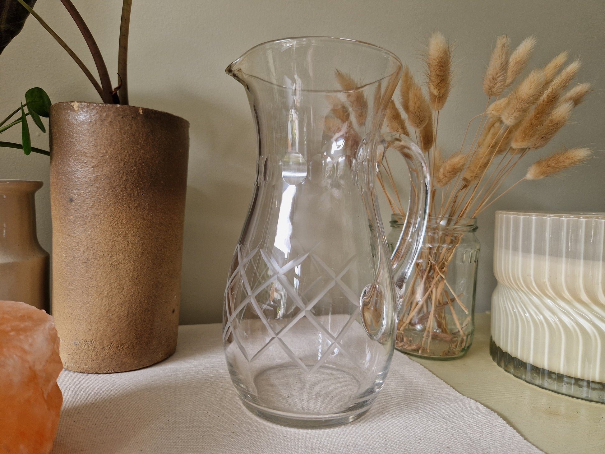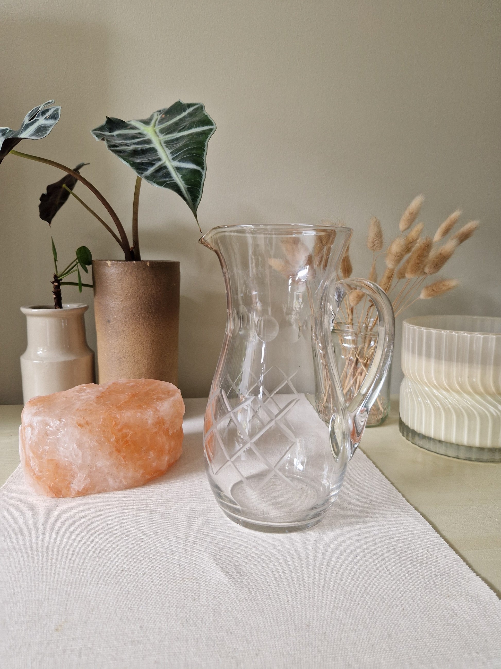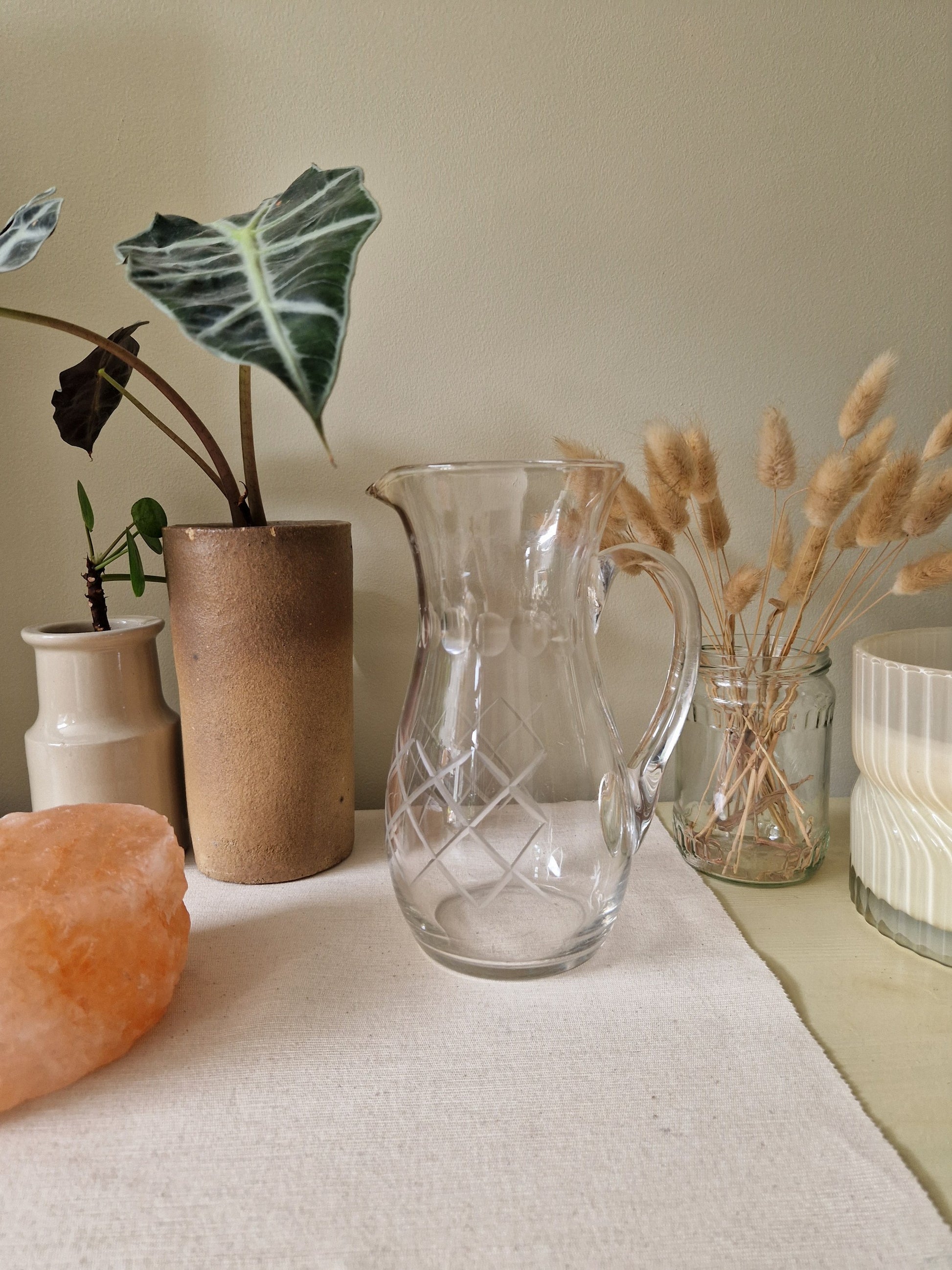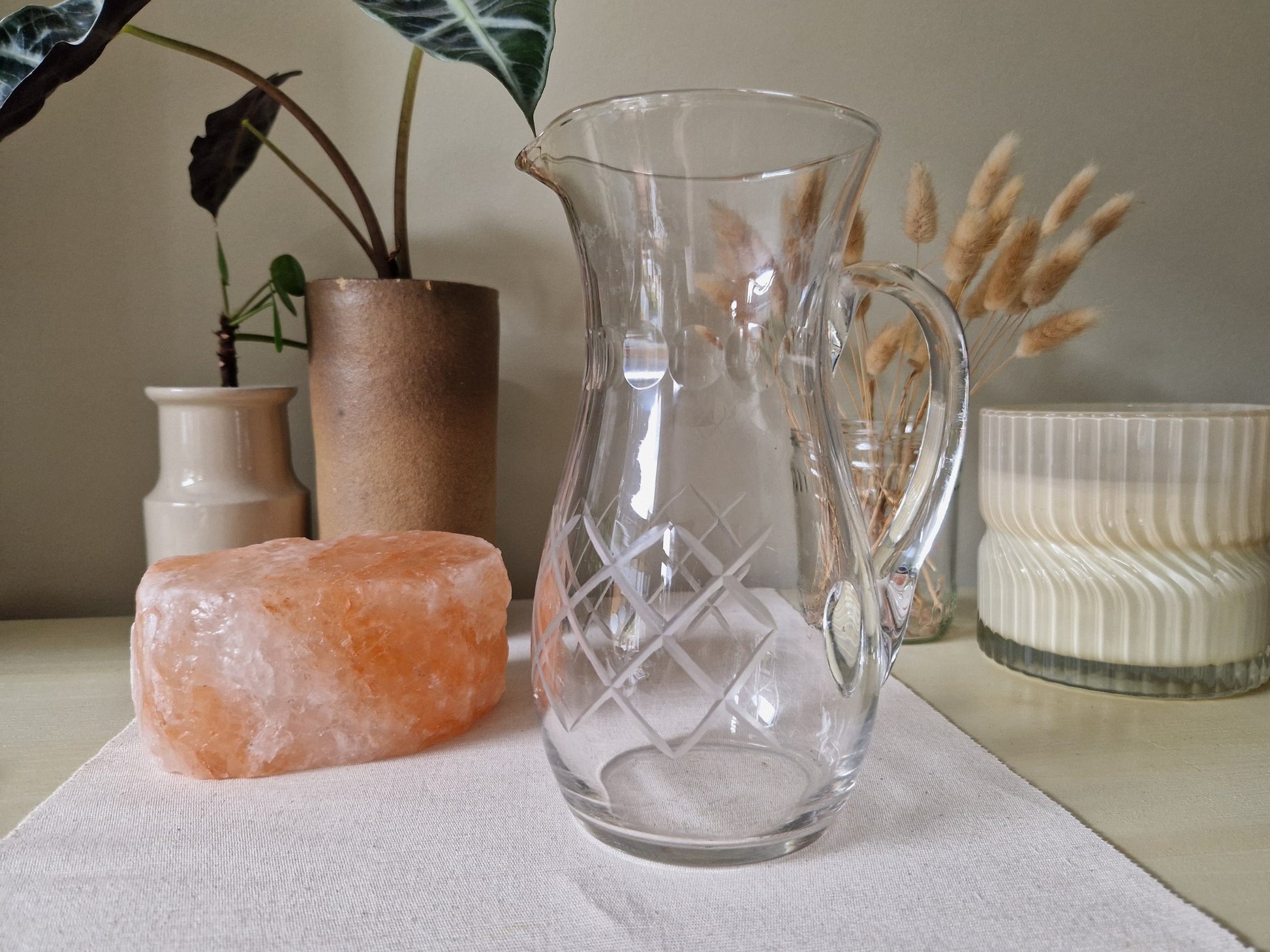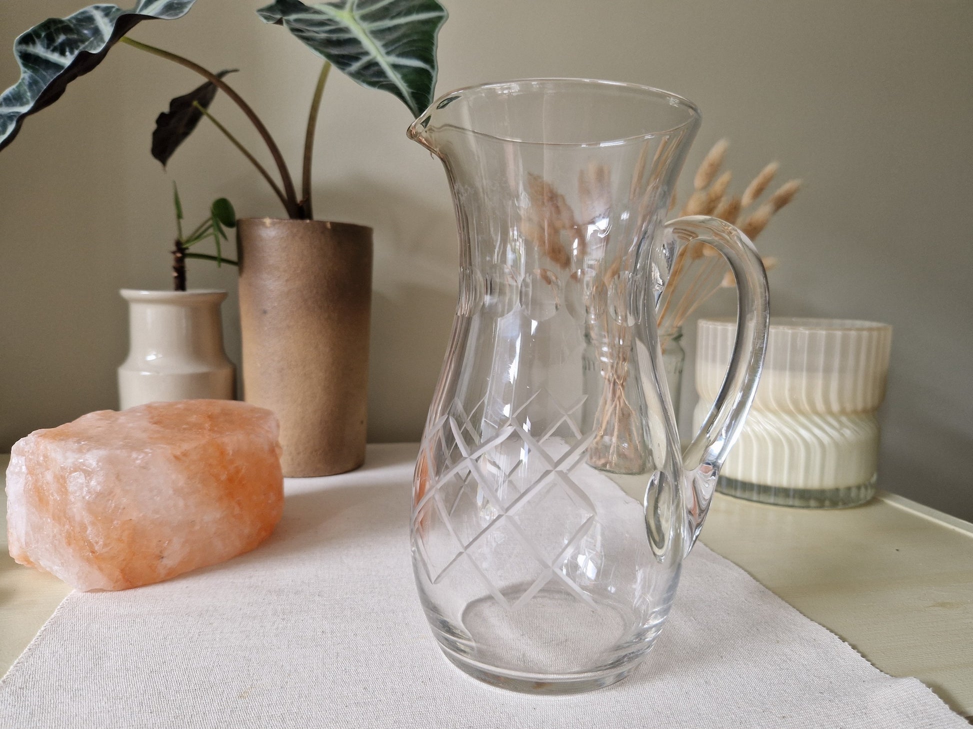 Deze stijlvolle glazen schenkkan is versierd met een ingegraveerd ruitpatroon en is perfect voor het serveren van water, sap, of andere dranken. De kan heeft een comfortabele handgreep en schenktuit, waardoor het schenken eenvoudig is. De kan verkeert in goede conditie.