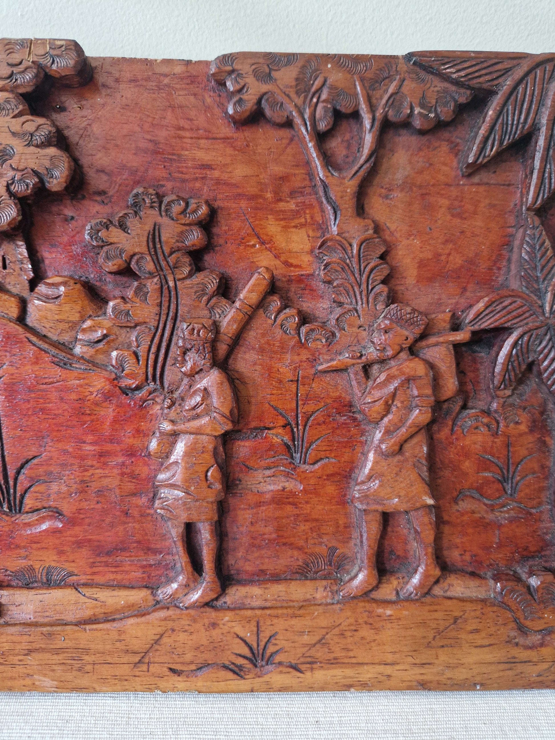 Deze houtsnijwerk wanddecoratie, met afmetingen van 23 cm hoog, 41 cm breed en 2 cm diep, is een mooie toevoeging aan elk interieur. Het gedetailleerde houtsnijwerk toont een scène die doet vermoeden dat het uit Azië komt, met zorgvuldig uitgewerkte figuren en natuurlijke elementen.