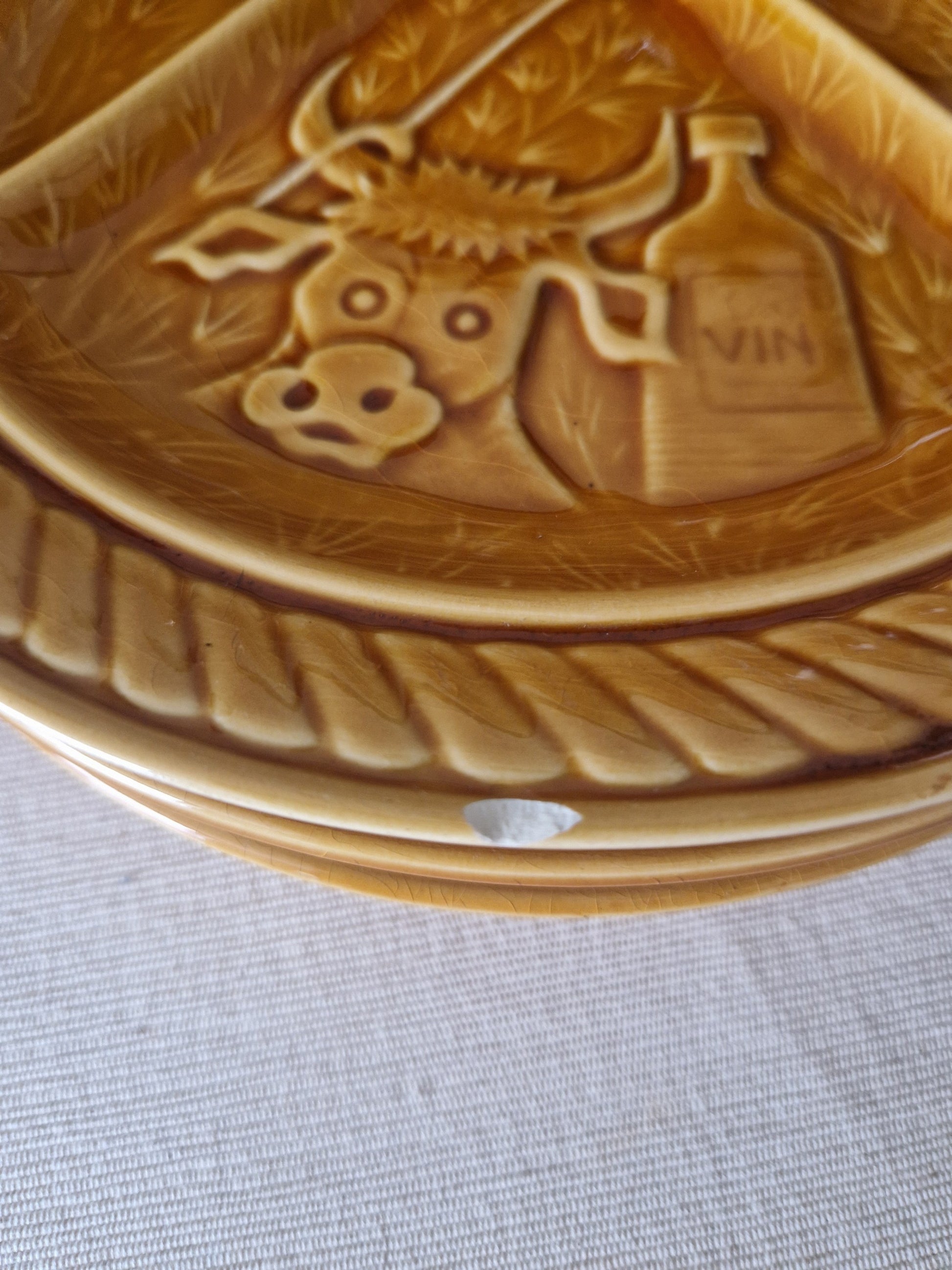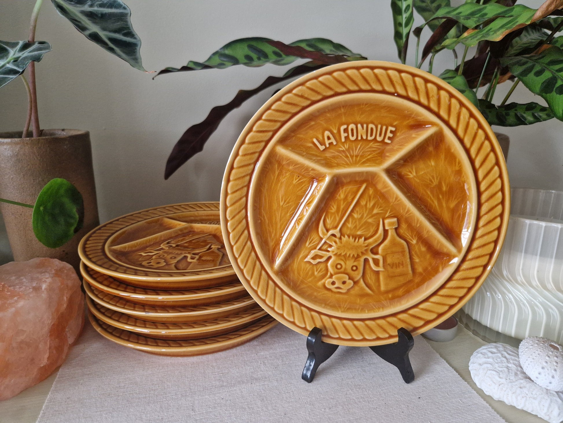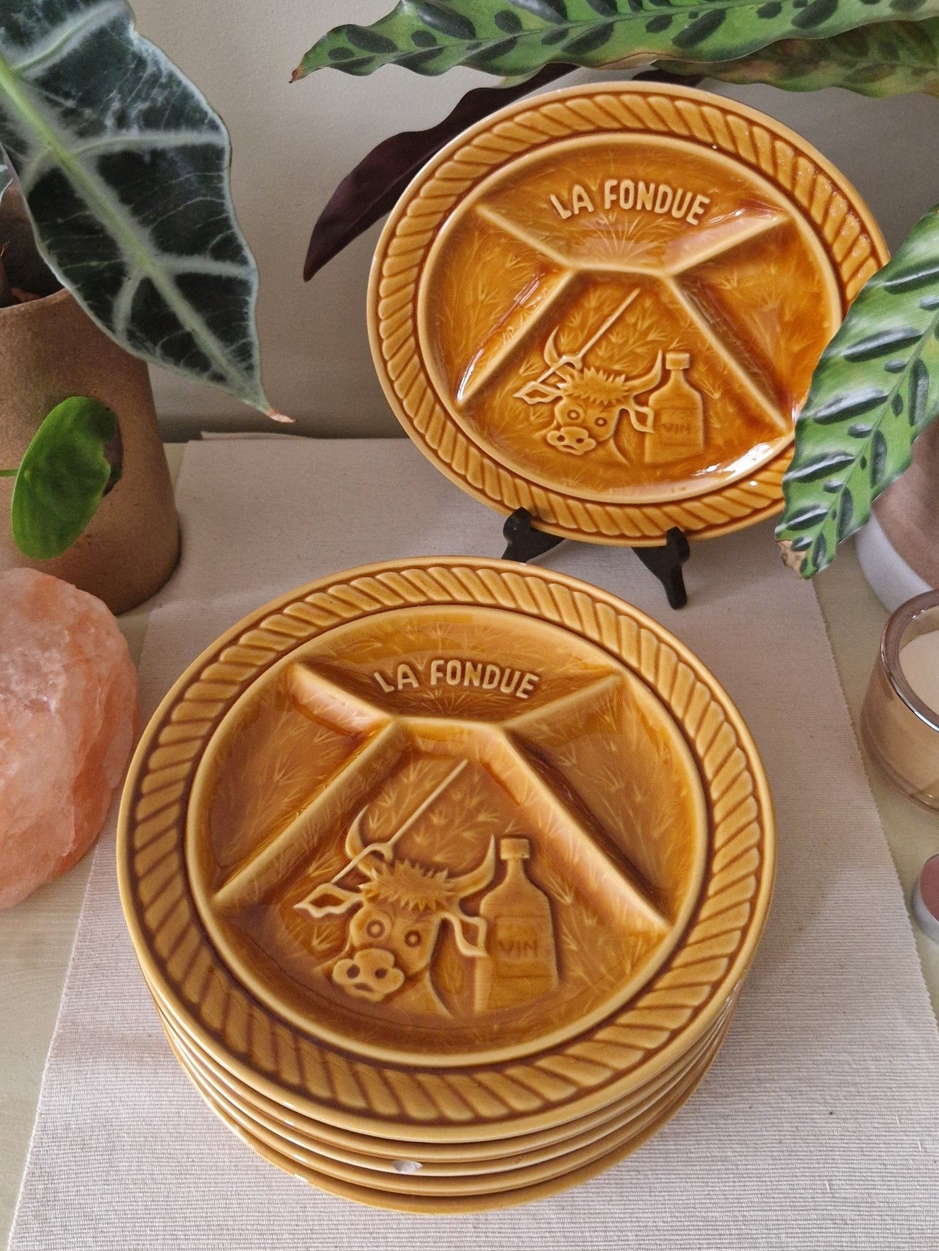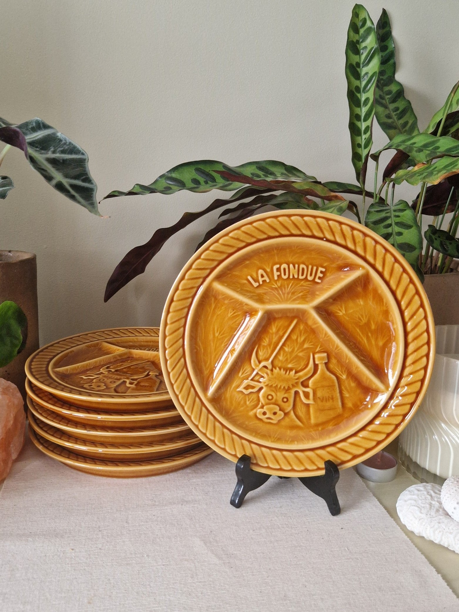 Tags: vintage fondueborden, Sarreguemines Frankrijk, jaren '70 servies, keramische borden, Franse fondueborden, retro servies, kaasfondue borden, vintage keukenaccessoires, Sarreguemines "La Fondue".
